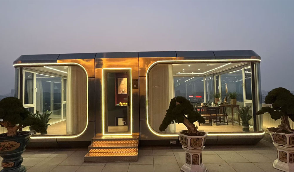 偉業星艙,長8.4m,寬4.8m,高3.3m,自重8.7t。整體空間40平方米。星艙外立面選用304 2mm油磨拉絲納米抗指紋涂層不銹鋼。中間選用了7-10cm 厚聚氨酯發泡層,并整合不銹鋼一體板工藝技術,大幅提升了空間保溫隔熱性能,有效阻隔了室外高溫或低溫傳導;玻璃采用8mm-12mm中空加氣工藝,從根源上減少空氣傳導熱,并搭配了使用壽命不低于10年高性能耐候膠,無論是炎熱夏季還是寒冷冬季,都能讓室內保持舒適溫度,打造 “四季如春” 的居住體驗。
